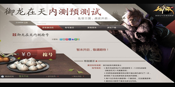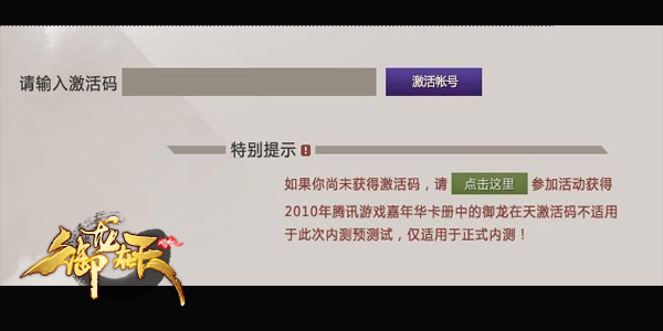 5月1日起,腾讯第一国战网游《御龙在天》开启平媒激活码发放活动。活动以兑换码抽奖的形式开展。活动开始之后,只要从指定媒体处领取兑换码,就能进入“抢号激活专题”抽取5月18日《御龙在天》体验“门票”。