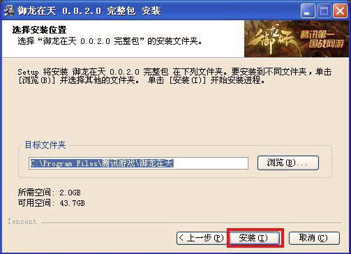 4、设置《御龙在天》安装路径,注意您当前可用空间的大小,点击【安装】继续;