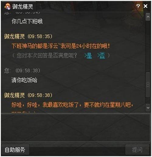 御龙精灵和一些大型的搜索网站相比,御龙精灵回答问题更具有针对性和实用性,也不会出现繁杂的内容,一对一的服务更加体贴,随时随地的询问,在游戏当中更加方便。而且御龙精灵也具有Qrobot的功能,能与玩家进行各种各样的交流,闲聊也拥有了一定的智能,在玩家感到寂寞的时候御龙精灵就可以帮你解闷。在御龙世界里面,小精灵会二十四小时陪伴着广大的御龙族,给玩家提供各种帮助。