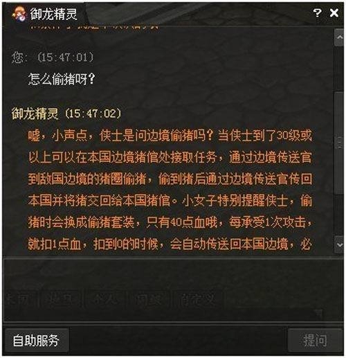 8月下旬御龙精灵已经正式上线了。御龙精灵是玩家在游戏中的一个助手,玩家在游戏中遇到的一些常见问题都可以询问御龙精灵。如:怎么偷猪?怎么赚钱?但御龙精灵是无法辨别错别字、繁体字、火星文等文字,在询问御龙精灵的时候要注意使用正确的汉字和语法提问。在Cross版面上一个红色框框里的按钮就是御龙精灵了,点开就可以询问在游戏中不懂的内容。在这里御龙精灵可以帮助广大御龙族更好的体验《御龙在天》。