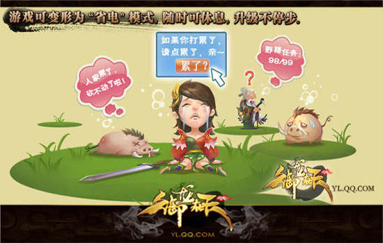 在目前市场上众多MMOPRG类网游中,频繁的刷怪和任务使得玩家们容易游戏疲劳,升级带来的大量电力损耗更是颇为可观。针对此类问题,《御龙在天》即将于不删档内测中推出“游戏可变形为省电模式,随时可休息,升级不停步”的革新。玩家只需要点击“累了”即可进入省电模式,客户端迅速变形,经验照样得,升级不停步。凭借新革新的“省电模式”和此前已经开放的经验累积功能,御龙族们躺着也能升级。