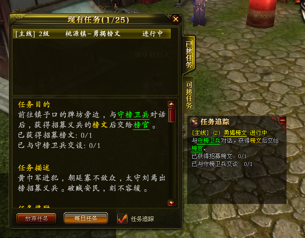 任务追踪界面中黄色文字信息表示尚待完成的任务,点击带有下划线的任务名称可打开任务面板查看任务详细介绍,当完成任务后,任务名由黄色变为绿色。