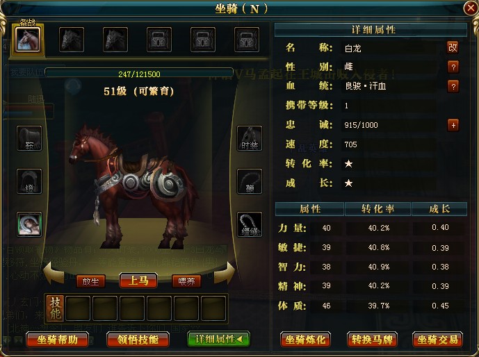 坐骑有三个成长阶段,第一个阶段是小马驹(1-19级),第二个阶段是可乘坐的坐骑(20-29级),第三个阶段是可在坐骑上参与战斗的战骑(30-180级)。(这个时候可以为马匹添加一些装备,装备是有属性加成的)