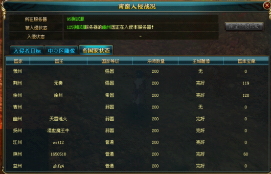1、南蛮入侵是以国家为单位开启的活动,发起入侵的为一个国家,但入侵目标为一个服务器;
