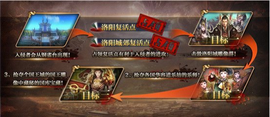 iv. 如果入侵者将守卫和将军击杀,则会刷新新的守卫和将军,归属于入侵者。此时该复活点被入侵者占领,入侵者死亡后选择原地复活,如果距离洛阳最近,则可以在该复活点复活。