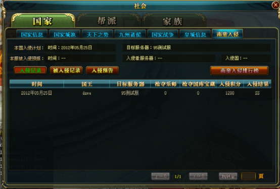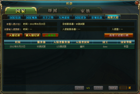 2、入侵结束可在“社会”界面的“国家”页面的“南蛮入侵”分页查询入侵记录,系统根据入侵积分判断入侵行为的等级。