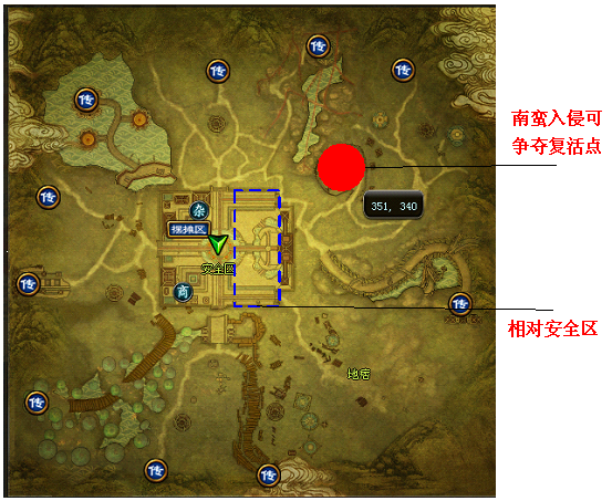 iii. 南蛮入侵开始后,该地方刷新守卫和将军,归属于本服务器。本服务器玩家在铜雀台和洛阳死亡之后,选择“安全复活”可以复活在该复活点。