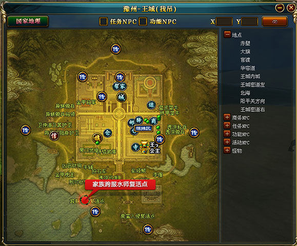 1发起家族跨服远征成功后,会给家族内满足条件的在线玩家发送系统召集令,玩家确定则被立即传送到王城家族跨服使者;2玩家与王城国王雕像旁的“家族跨服远征使者”对话选择“我要进行家族跨服远征”,在确认了“家族跨服远征协议”,确认即开始跨服传送;3家族跨服开始后,目标服务器目标国家的玩家不会收到系统告知;4家族跨服远征会传送到目标服务器的目标国家的王城,地点如下图所示: