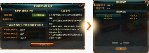 > 与NPC家族活动管理员的对话选择“发布家族跨服远征”选项,家族长选择该选项则进入家族跨服远征申请界面;