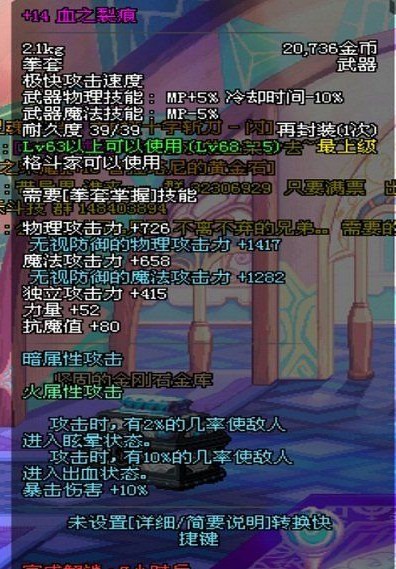 +14【血之裂痕】,68粉拳套,+14超高强化等级。武器物理技能MP+5%,冷却-10%。触发特效有2%的几率使敌人进入眩晕状态2秒,还有10%的几率使敌人进入出血状态,每0.5秒受到2000点伤害。更有爆伤+10%,强化14层后拥有超高的物攻、魔攻和独立攻击,转为格斗家设计,助你成为武神。