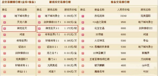本周游戏币排行:本周游戏币交易排行《地下城与勇士》《剑侠情缘3》《御龙在天》依然领先。《传奇世界2》本周表现不俗。传世新版本公测后,推出了第四职业妖士,打破了战士法师道士的万年铁三角,也打破了游戏的平衡,新职业妖士表现惊艳,其他三个职业该何去何从?全新的地图、全新的玩法,都需要玩家去摸索,这给这款老游戏带来了新的生命。同时,盛大的另一款游戏也因新职业新版本火了一把,那就是《龙之谷》。依靠着新职业“舞娘”,本周龙之谷也登上了游戏币交易TOP10榜单,前景看好。