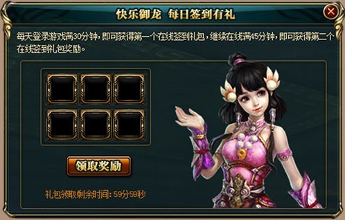 每天首次登录你只要在线满30分钟,即可获得第一个在线礼包奖励,继续在线45分钟,即可获得第二个在线丰厚礼包奖励。