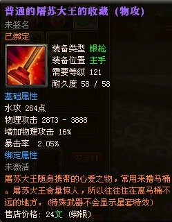 屠苏大王的收藏,是银枪121级的主手武器。其基础物理攻击最高可达到3888,还额外增加物理攻击16%,以及水攻和暴击率都有大幅度的提升,正所谓一枪在手,天下我有!