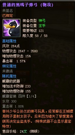 黑鸭子弹弓,乃是神弓121级的主手武器。除了风属性攻击与暴击的加成让其它武器逊色之外,它的基础物理攻击与额外增加的物理攻击百分比也是非常可观的。