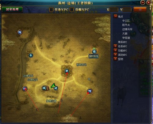 A点对A点,B点对B点,至于C点,那是开始入侵大军第一个必争之地,到达C点的时候,这里会有像护旗将一样的NPC,全部干掉,就夺下了,(这是一场硬仗,因为这时候是YZM+“护旗将”VS入侵大军。)夺下以后,可以安全了,安全后的复活点就在这点C,这时候还没买到衣服的人注意了,千万别安全,等2分钟,YZM走了,恭喜你,你买衣服已经没有人能阻挡你的脚步了,买了衣服在冲过来吧