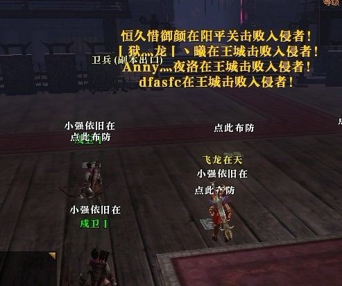 进图之后,原地不动,会看到一个叫副本出口的NPC,如图所示,第一个塔基不要做兵,然后沿着这个方向做5个一等戍卫。