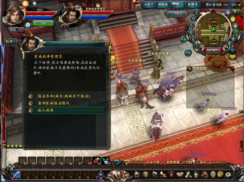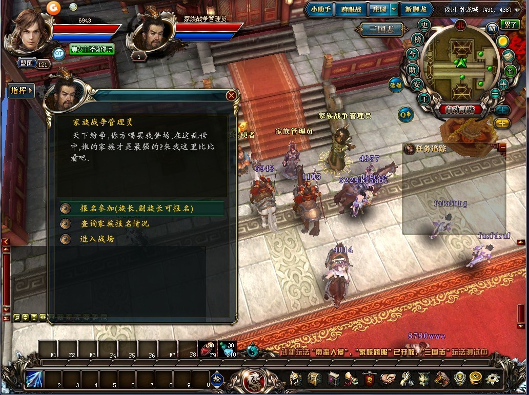 家族的族长以及副组长可以通过在对应报名NPC处报名获得参与机会,系统会根据家族玩家的等级和装备水平对家族进行系统匹配。匹配完成后,会对家族进行系统提示,以及倒计时准备,倒计时结束后,双方玩家传送比赛地图。