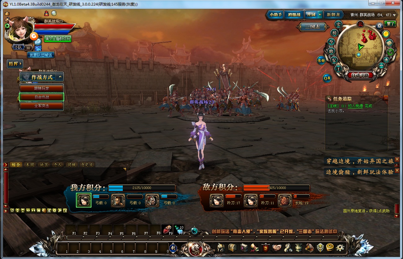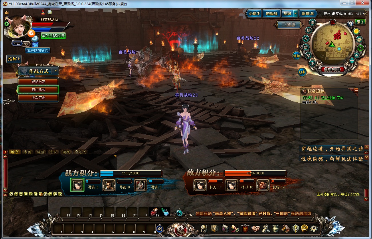 御龙群英争霸是基于御龙在天的三国题材,以玩家为基础,结合三国史实武将以及兵法的全新玩法。在30级以前玩家可以通过PVE玩法初步了解群英争霸玩法的基本操作方式。30级以后,玩家则可以选择组队或者单人两种模式进行PVP对战。组队模式下每队上限人数为3人。目前,群英争霸将推出第一张对抗地图:中州新野,玩家可在此领略统领千军对阵杀敌的豪爽快感。