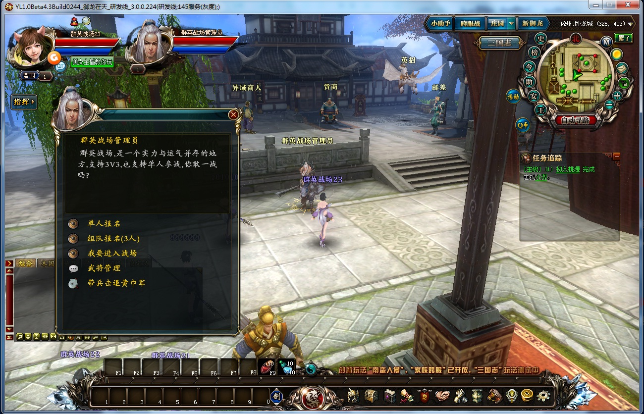 御龙群英争霸是基于御龙在天的三国题材,以玩家为基础,结合三国史实武将以及兵法的全新玩法。在30级以前玩家可以通过PVE玩法初步了解群英争霸玩法的基本操作方式。30级以后,玩家则可以选择组队或者单人两种模式进行PVP对战。组队模式下每队上限人数为3人。目前,群英争霸将推出第一张对抗地图:中州新野,玩家可在此领略统领千军对阵杀敌的豪爽快感。