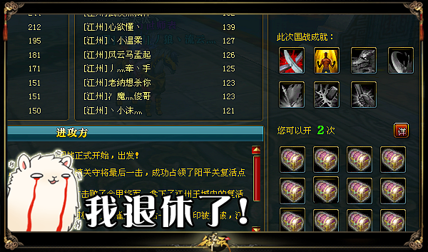 以往的国战,我们都了解,国战胜利的一方,不管你是否有参与其中,只要你在线,都可以获得一枚国战胜利羊驼,开羊驼有几率获得九鼎铠碎片,九个可以合成一件30天的九鼎铠时装。而现在的国战,不管你是否输赢,都有机会开箱子,只要你为国战奋斗过,为国家贡献过自己一份力都有机会开到好东西。这国战箱子里,有国战血纹,王者龙心,九鼎铠碎片,普通淬炼,玫瑰花,绑银,银子等等,都有几率开到,只不过箱子的品质是按照你们国战是否胜利来定的。
