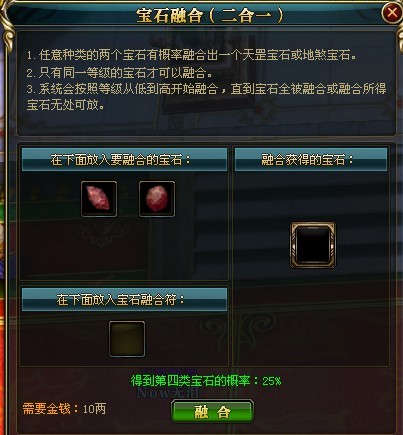 任意两种宝石可以通过宝石融合(二合一)合成,但几率只有25%呢,这个25的几率是指得到第四类宝石的几率哦,剩下的75%的几率会得到其他类宝石哦,例如智力啊物防等等呢。