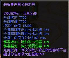 全等级全职业3、6、7、8星套增加4%~6%伤害豁免属性,120-150级12、15、18星套基础攻击、防御、生命值百分比全部提升2%。