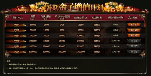 7月11日12点至8月25日24点,玩家可通过点击右侧侧边栏“财”字,或在暑期理财大臣NPC处(王城618,576)参与金子增值计划,获得超出预期的收益!最高收益可获得30%。同时抢先购买还可获得额外10%消费返还。