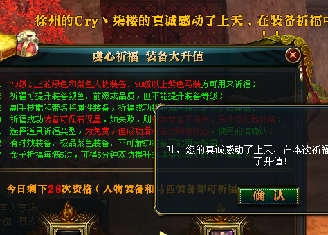 凌晨六点多醒了,游戏里这边看看,那边逛逛的。好吧,承认我昨天祈福成功后又导致我手又痒了,寄售行买了极品绿衣服65L,传到败走。真是的,一等祈福,直接给我来个恭喜xxx啦!真是的,搞的我都不好意思啦!