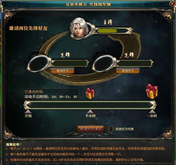 1、每天19:30-21:30期间,邀请两位好友作为先锋加入演兵,共同在线时间满足条件后都可获得丰厚奖励: