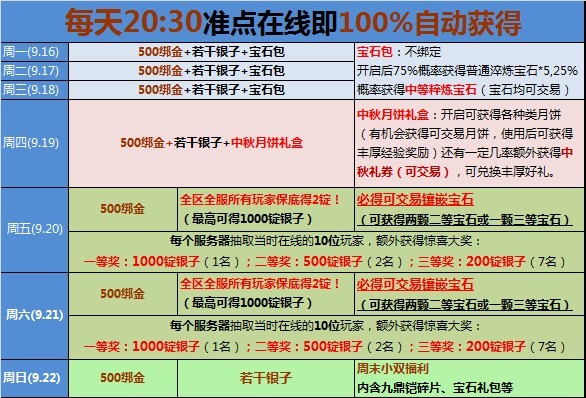 中秋佳节为回馈广大玩家的厚爱,从9月16日到22日(周一到周日),十亿豪礼狂欢派送,全民都能领贺礼!此外,周五周六周日准点在线,更有神秘超豪华礼包。