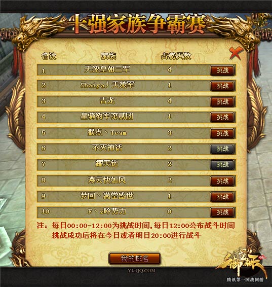 十强赛于2014年12月8日更新全区,12月9日零点开始正式报名开战,比赛时间持续一个月,以12月10月24点结果为结算标准。家族十强争霸赛可在右边栏“霸”字处或者王城(533,616)NPC处打开排行榜进行挑战。每日0-12点家族长可进行挑战报名操作,通过晋升排名至20名以内才能对10强家族发起挑战。战斗时长为90分钟,战前十分钟可进入主战场。待战斗开始后,不能以任何方式再进入战场。