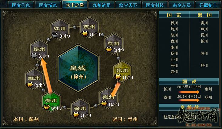 4月28日,【倾城名将】有两场国战,青州VS扬州和豫州VS荆州。青州和豫州是联盟,但因两边都有国战,只能暂时各自为战,相约结束一方可以支援另外一方。8点15分国战正式开始,青州爆掉镇关守将和金甲将军,即刻领取战车冲击内城,不断在青龙和白虎之间迂回。而部分骑兵也奔波在朱雀和玄武之间磨血,经过了近四十多分钟大战,青龙和白虎终于被青州爆掉,而此时朱雀和玄武也是残血,青州一鼓作气四点齐爆,中间神兽第一次激活,下血很快。徐州帝国和扬州无暇顾及,只得快速组织人马爆掉四大神兽。中间神兽剩下30%左右血量之时石化,青州或许此时做出了一个不太明智的抉择,选择战车继续冲击内城攻打青龙和白虎,耗时太多,最终白虎和青龙并未被爆掉,国战也只能含恨而终。
