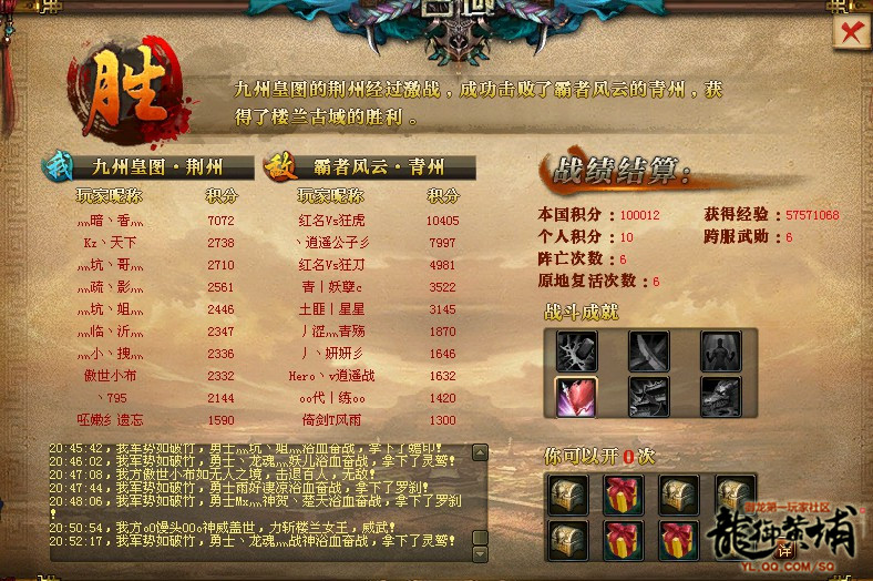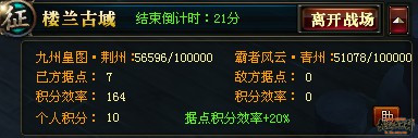 楼兰是【九州皇图】荆州对战【霸者风云】青州,而此时原本打算放弃楼兰的【九州皇图】荆州大部分人还在本国护车,并没有进入战场,【霸者风云】暂时领先。众所周知,【霸者风云】青州是【九州皇图】青州的势力,因此也是【九州皇图】荆州的大敌,当荆州得知对手是【霸者风云】青州时,燃起了斗志,高战和主力一拥而入,战局立刻倒转,【霸者风云】青州虽然坐拥五套超级给力的十八星,但国力仅仅只有不到一百万,还不到【九州皇图】荆州的一半,而【九州皇图】荆州也同样拥有众多十八星,所以对于【九州皇图】荆州的进攻,【霸者风云】青州显得毫无招架之力,比分轻松被超过,之后就再没有翻盘的机会。毫无意外的【九州皇图】荆州,赢得了此次楼兰。
