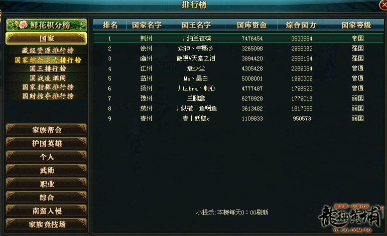 荆州自从上一次合区之后,经历了多次换王,动荡之余也流失了许多人,近期豫州、幽州、荆州联盟整合国家,三国联盟之后,荆州迎来了合区后的巅峰时代,众多十八星和诸多主力家族的鼎力加盟,国力和战斗力都直线飙升,已然成为本服第二强国。
