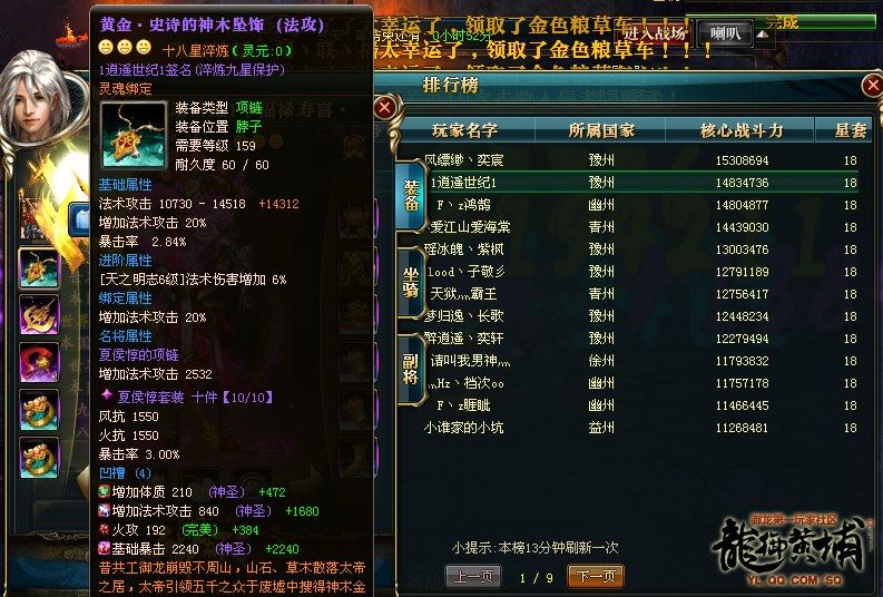 现在的l逍遥世纪l虽然本人比较忙,但还是没有放下《御龙在天》,仍然积极投入其中,充值也不予余力,只要有需要肯定会第一时间投入金钱,提升自己的属性。而这次的项链黄金精源与副手黄金精源刚刚出来,他的账号就第一时间参与到活动中,成功开出了最后两个部位的黄金精源,使得他成为第一位完成全套黄金装备的玩家,也为他的《御龙在天》之路再添辉煌。