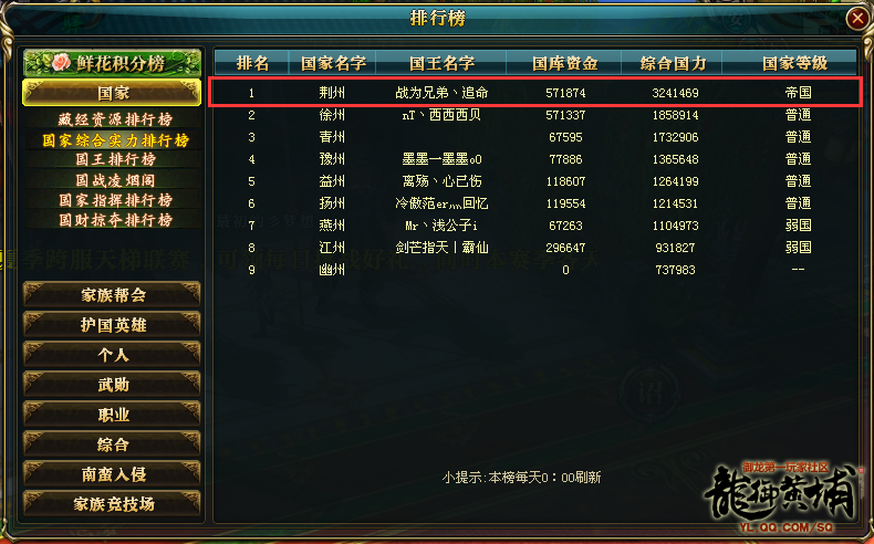 在国家综合实力排行榜上,荆州已经稳居帝国之位,排行第二的国家徐州也只是个普通国,无法与帝国荆州相比。